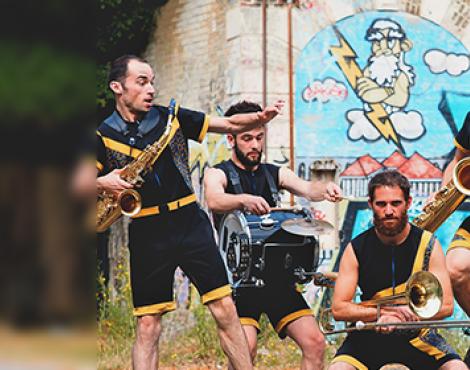 Des fanfares, il en existe. Des petites, des grosses, des velues, des tendres, des potaches, des sérieuses... Mais une fanfare qui racle le bitume à coups de sueur, qui inonde les champs de blé de transpiration, qui envoie au ciel du muscle et du son, il n'en existe qu'une. Mouv'n’Brass vous promet des lendemains qui chantent, des courbatures de plaisir d'avoir vu son corps lâcher prise, des cheveux qui repoussent et des sourires éternels. Des riffs qui claquent, des corps qui se meuvent, 5 paires de jambes et de bras pour embrasser le public : Mouv'n’Brass, la fanfare qui danse.